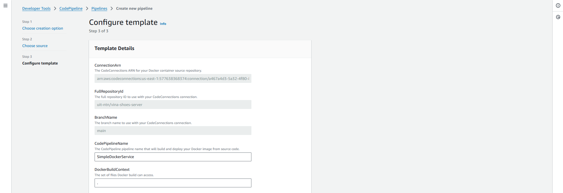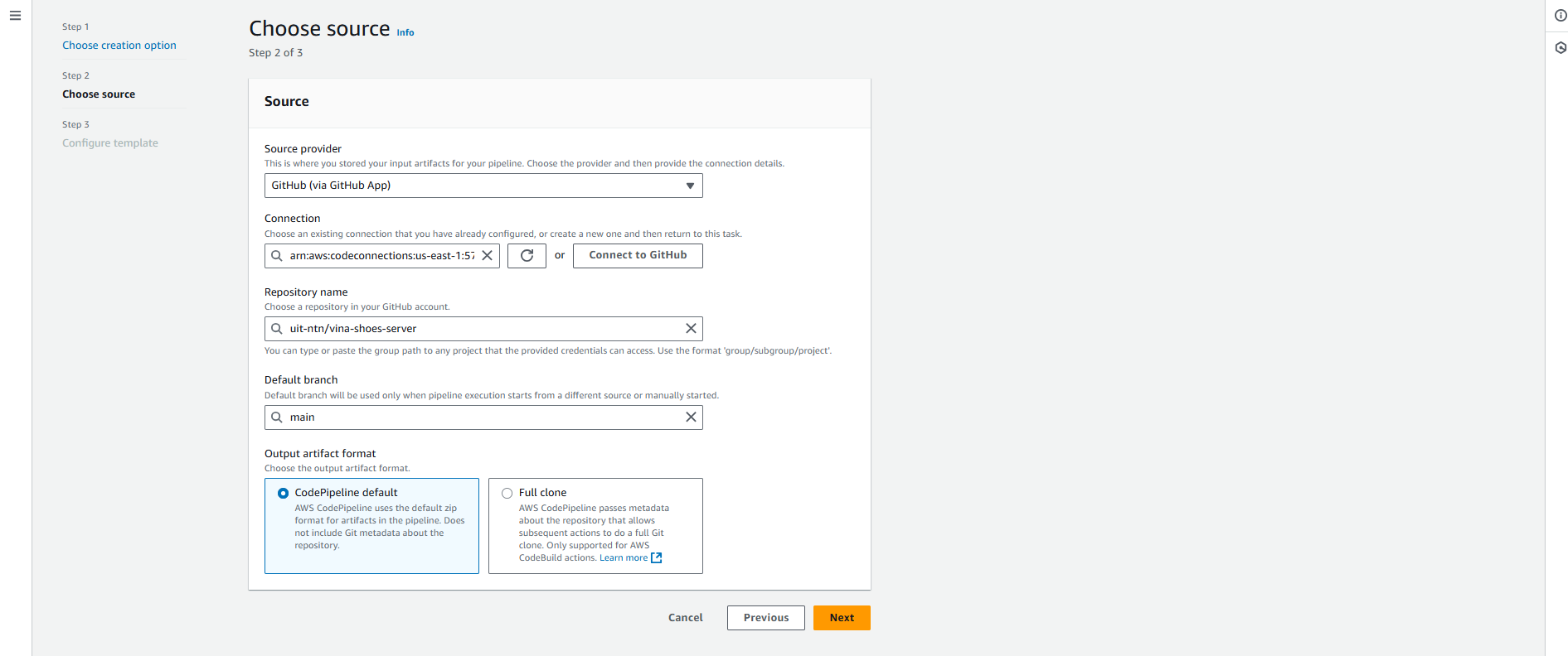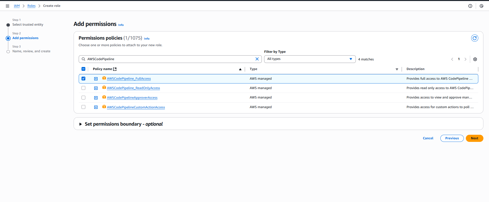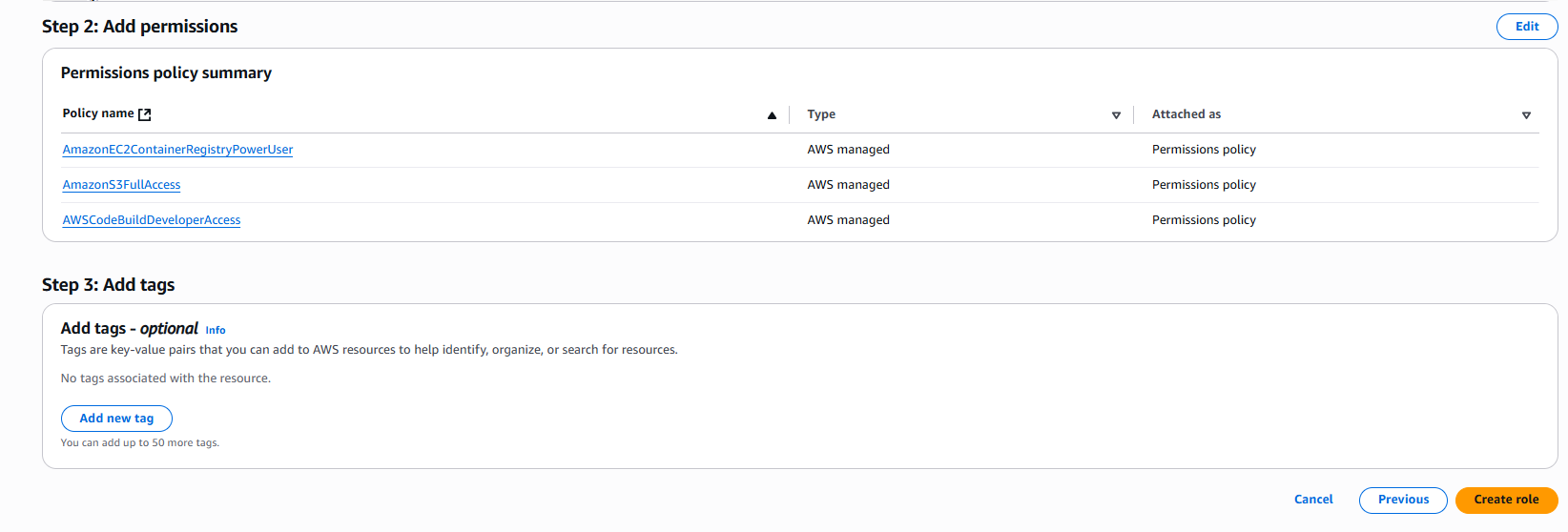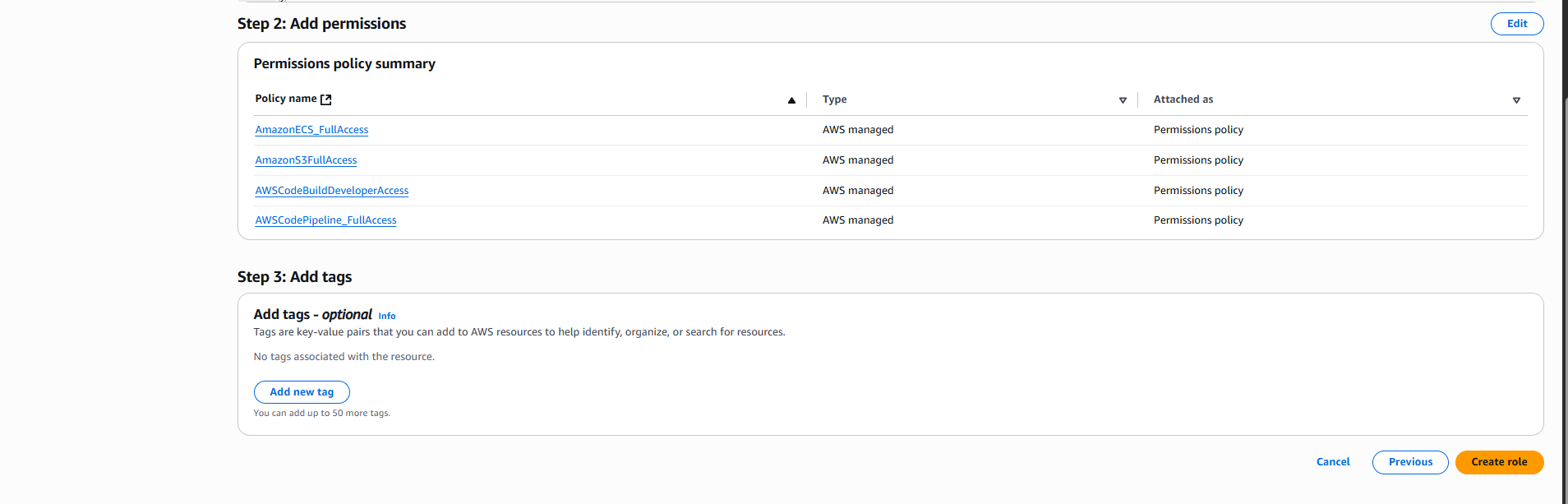 AWSCodePipelineFullAccessAmazonECS_FullAccessAmazonS3FullAccessAWSCodeBuildDeveloperAccess📝 Lưu ý: Nếu không tìm thấy AWSCodePipelineFullAccess, có thể sử dụng: