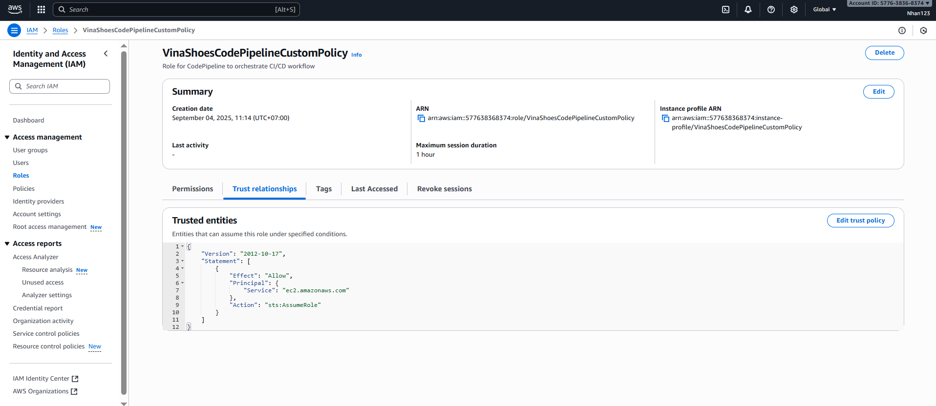 VinaShoesCodePipelineRoleRole for CodePipeline to orchestrate CI/CD workflow
