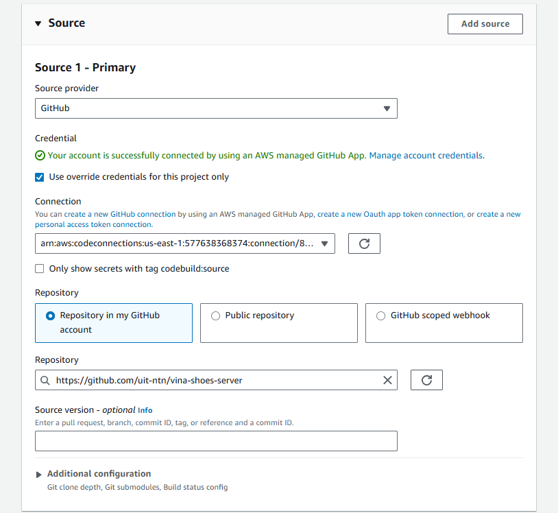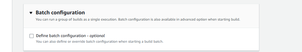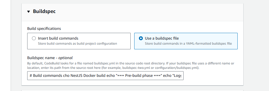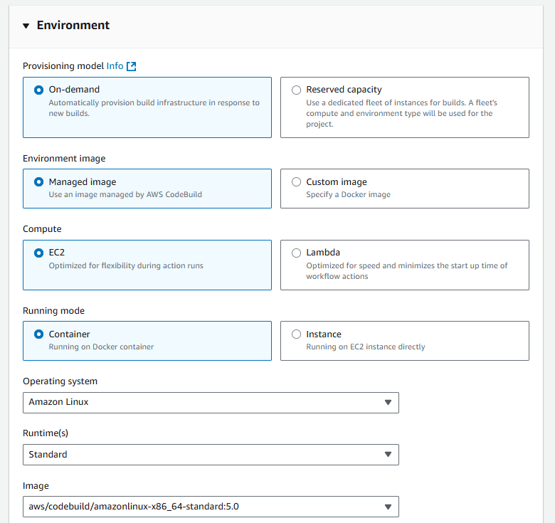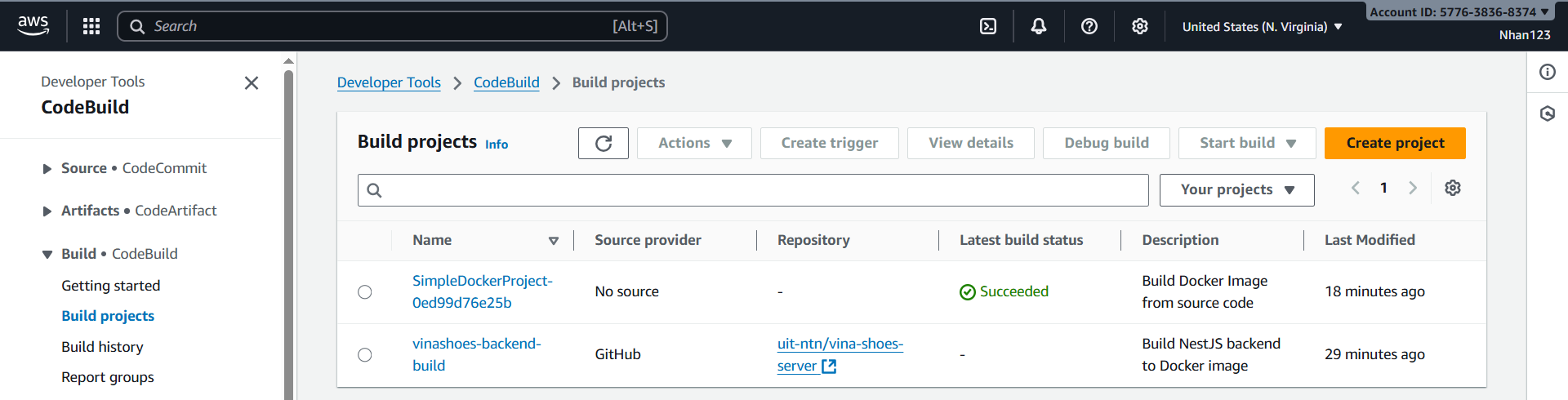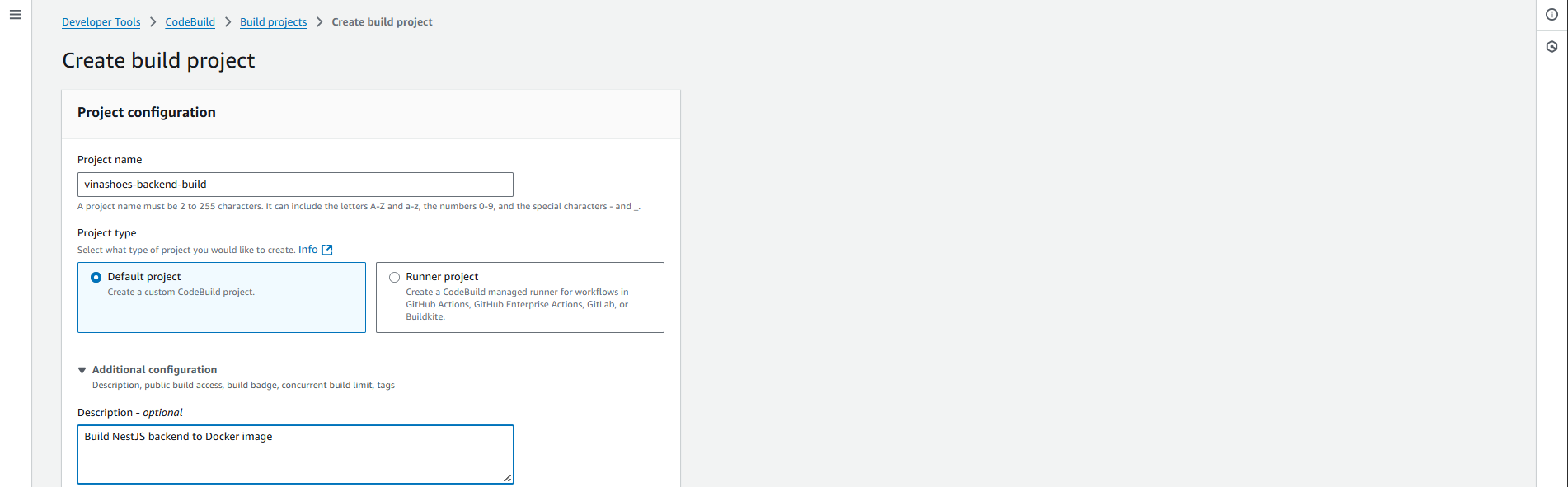 AWS Console → Developer Tools → CodeBuild → Build projects → Create build project: