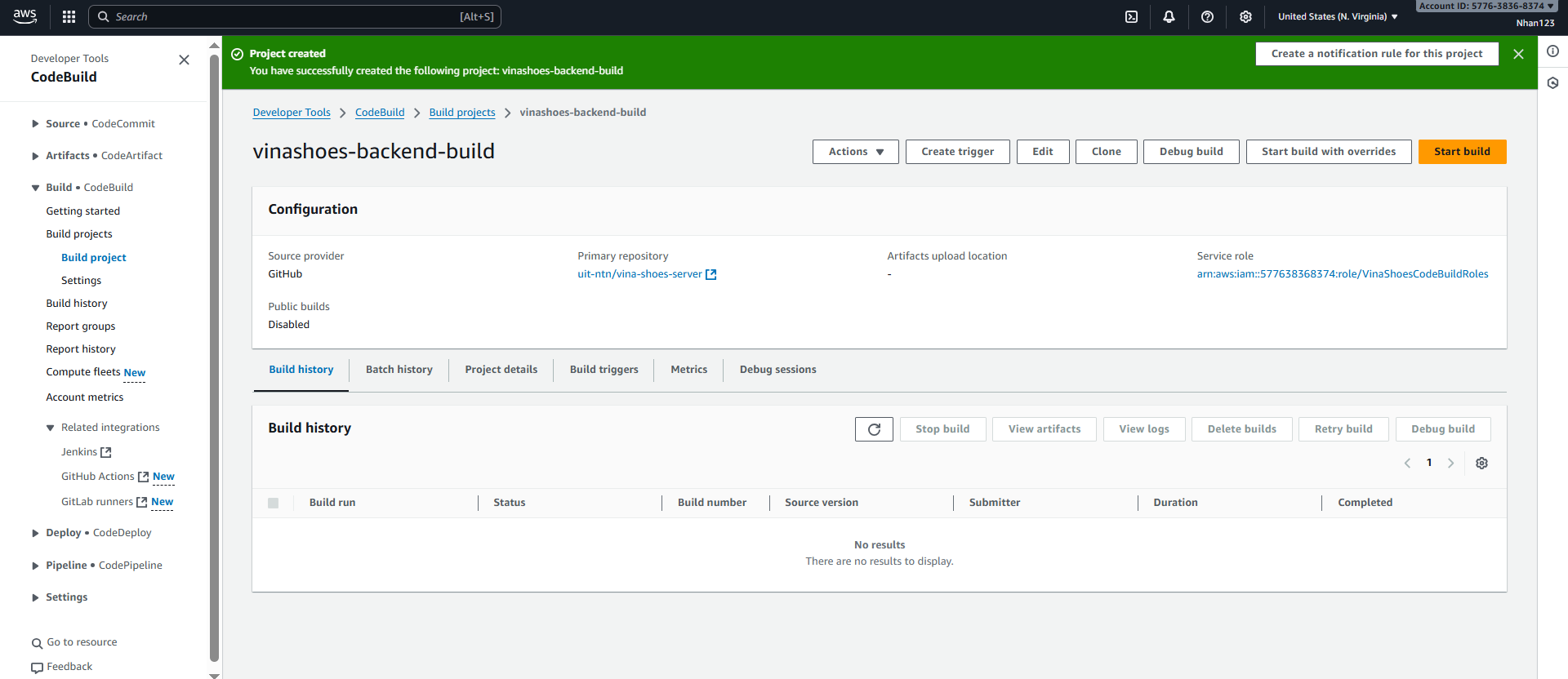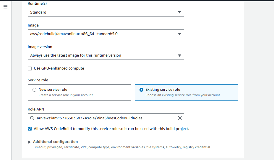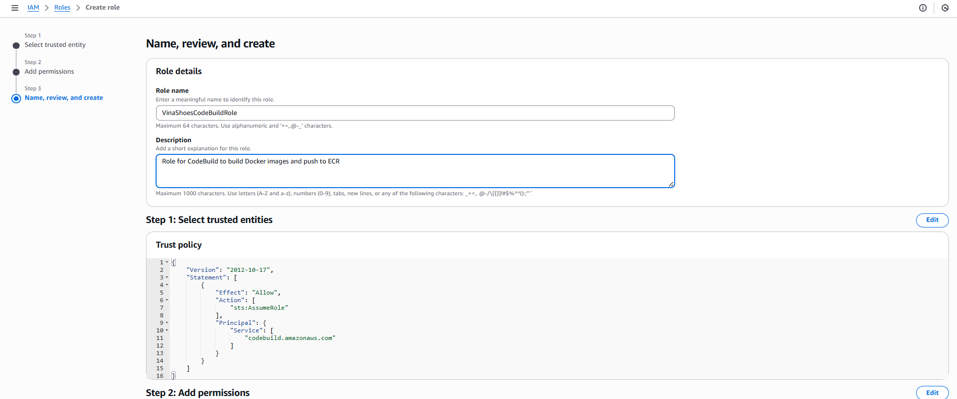 VinaShoesCodeBuildRoleRole for CodeBuild to build Docker images and push to ECR